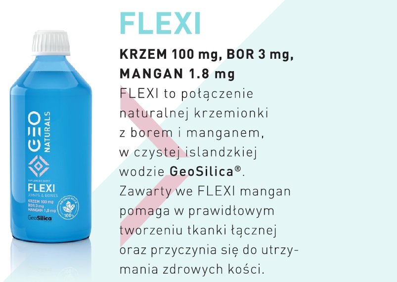 GEONATURALS FLEXI to połączenie naturalnej krzemionki z borem i manganem, w czystej islandzkiej wodzie GeoSilica®. Zawarty we FLEXI mangan pomaga w prawidłowym tworzeniu tkanki łącznej oraz przyczynia się do utrzymania zdrowych kości.