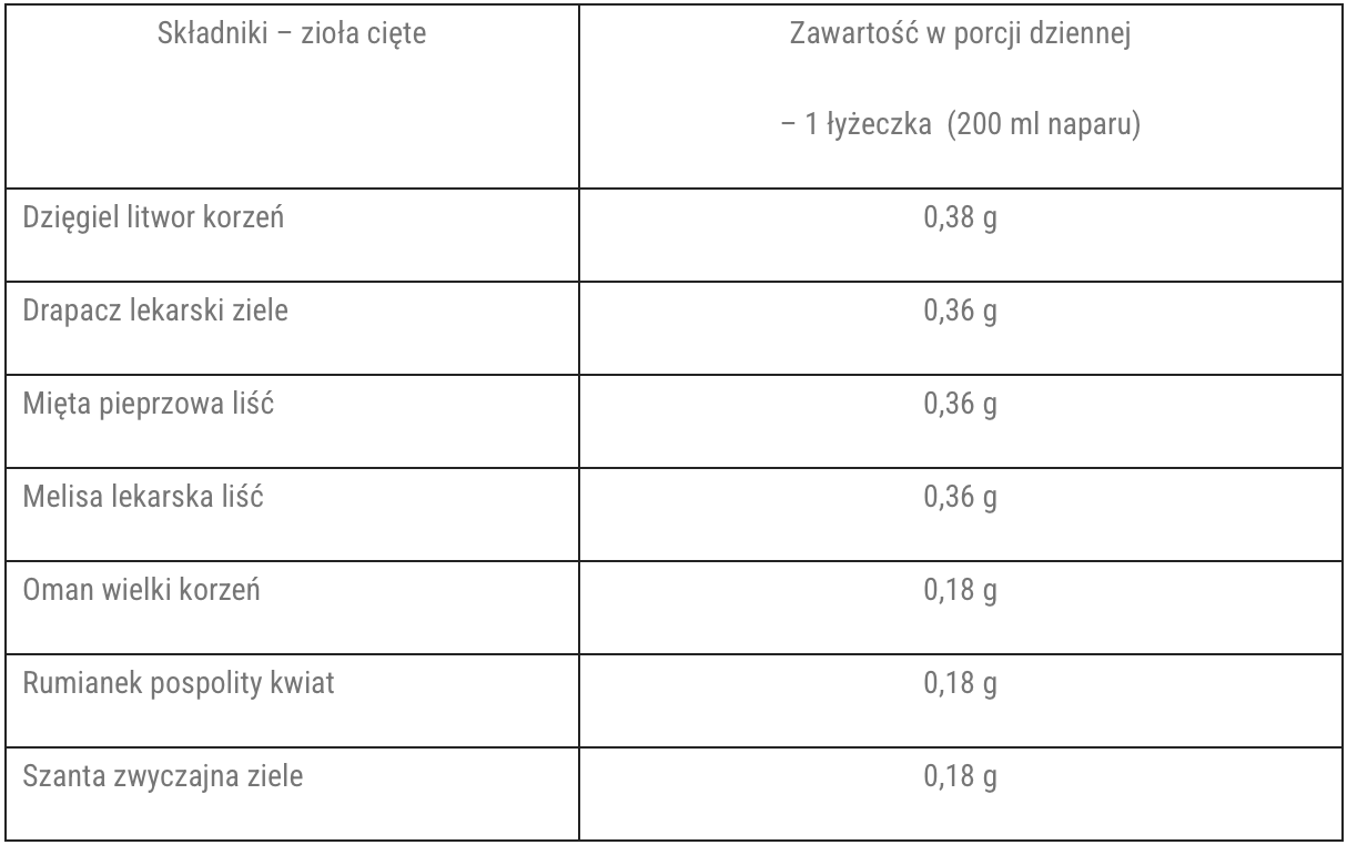 Dzięgiel litwor ułatwia trawienie, wpływa na fizjologiczną równowagę pH żołądka. Drapacz przyczynia się do prawidłowego funkcjonowania przewodu pokarmowego. Mięta wspomaga trawienie, wpływa pozytywnie na zdrowie jelit, pomaga przy wzdęciach i skurczach brzucha. Rumianek wspomaga leczenie dolegliwości żołądkowo-jelitowych, łagodząc skurcze i wzdęcia.