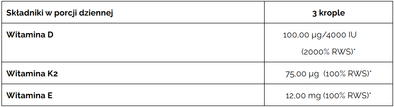 Składniki: Oliwa z oliwek extra virgin, witamina E (octan-d-alfa-tokoferylu), witamina K2 ( menachinon-7), witamina D (cholekalcyferol).