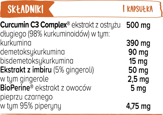 Ekstrakt ostryżu długiego (Curcuma longa) standaryzowany na 98% kurkuminoidów DER 65:1, ekstrakt z imbiru (Zingiber officinale) standaryzowany na 5% gingeroli DER 30:1, ekstrakt z pieprzu czarnego (Piper nigrum) standaryzowany na 95% piperyny DER 50:1, hydroksypropylometyloceluloza (otoczka kapsułki).