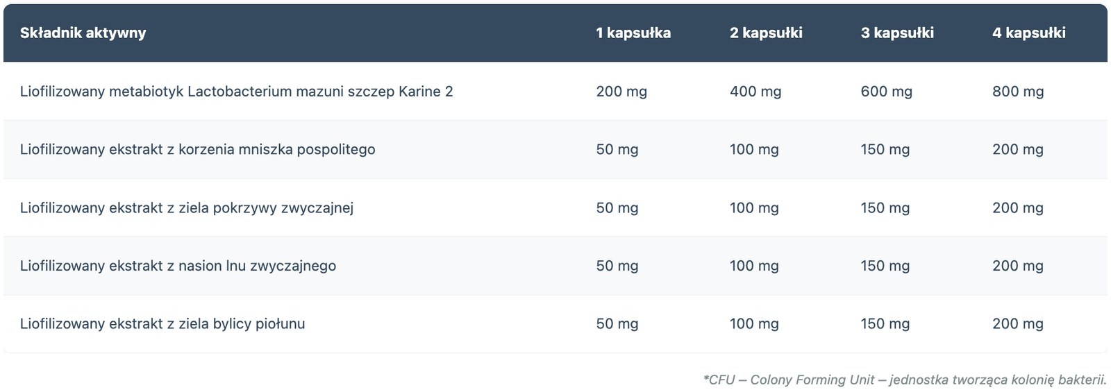 liofilizowany metabiotyk Lactobacterium mazuni szczep Karine 2, liofilizowany ekstrakt z korzenia mniszka pospolitego (Taraxacum officinale Web.), liofilizowany ekstrakt z ziela pokrzywy zwyczajnej (Urtica dioica L.), liofilizowany ekstrakt z nasion lnu zwyczajnego (Linum usitatissimum L.), liofilizowany ekstrakt z ziela bylicy piołunu (Artemisia absinthium L.), substancja żelująca: guma gellan, substancja glazurująca: hydroksypropylometyloceluloza.