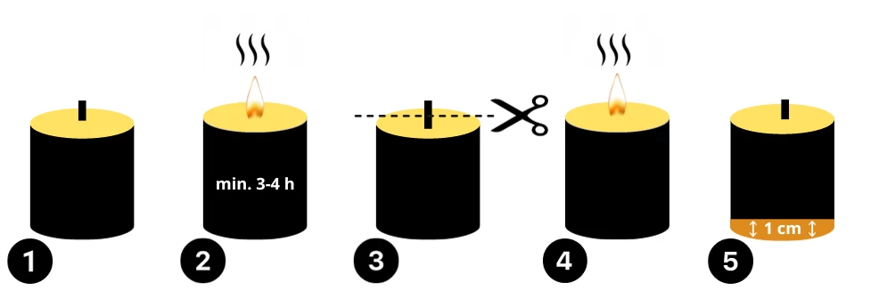 - Pierwsze zapalenie: Aby uniknąć zjawiska tunelowania, pal świecę do momentu całkowitego rozpuszczenia się wosku na całej powierzchni (zajmuje to około 3-4 godziny).