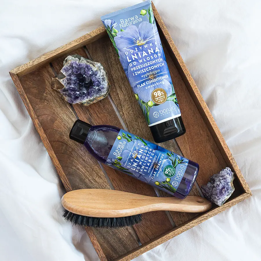 Szampon do włosów lniany z serii Barwa Naturalna został zainspirowany domowym zabiegiem laminowania włosów i skóry głowy. Naturalny wyciąg z lnu wykazuje bardzo dobre właściwości powlekające i osłaniające. Szampon sprawia, że włosy stają się miękkie, nawilżone oraz jedwabiście gładkie.