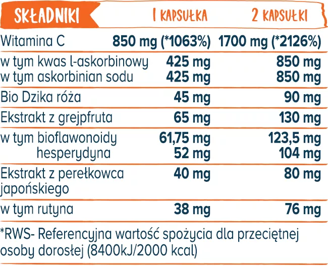 Kwas l-askorbinowy, askorbinian sodu, BIO dzika róża, ekstrakt z grejpfruta standaryzowany na 95% bioflawonoidów oraz 80% hesperydyny, ekstrakt z perełkowca japońskiego standaryzowany na 95% rutyny, otoczka kapsułki: hydroksypropylometyloceluloza